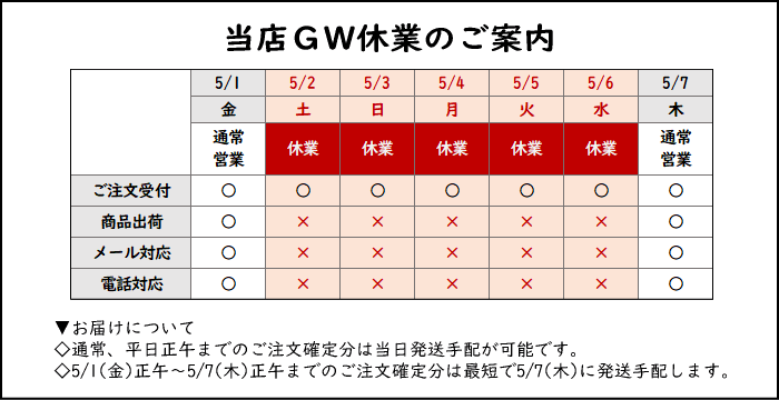 ■当店営業日:平日9-17時(土日祝日休)。平日正午までのご注文確定分は当日発送手配します。